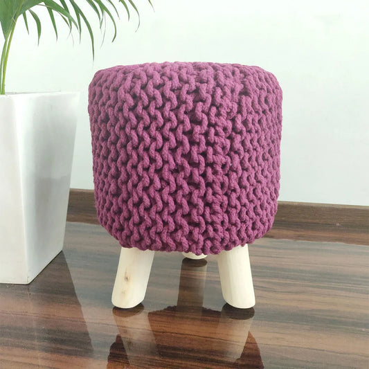 Avioni Home Luxury Collection – Hand Knotted Boho Look Stool / Ottoman (3 Legs-Natural Finish) – Medium Violet / Red