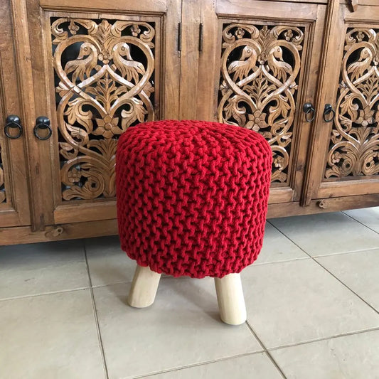 Avioni Home Luxury Collection – Hand Knotted Boho Look Stool / Ottoman (3 Legs-Natural Finish) – Red