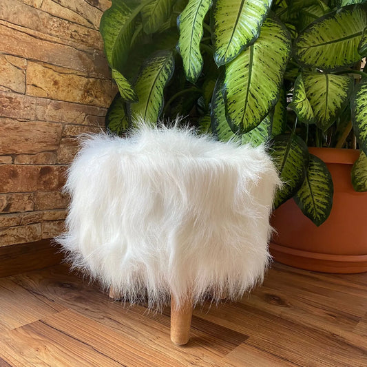 Avioni Home Luxury Collection – Padded Stool / Ottoman (3 Legs With Natural Finish) – Long White Fur