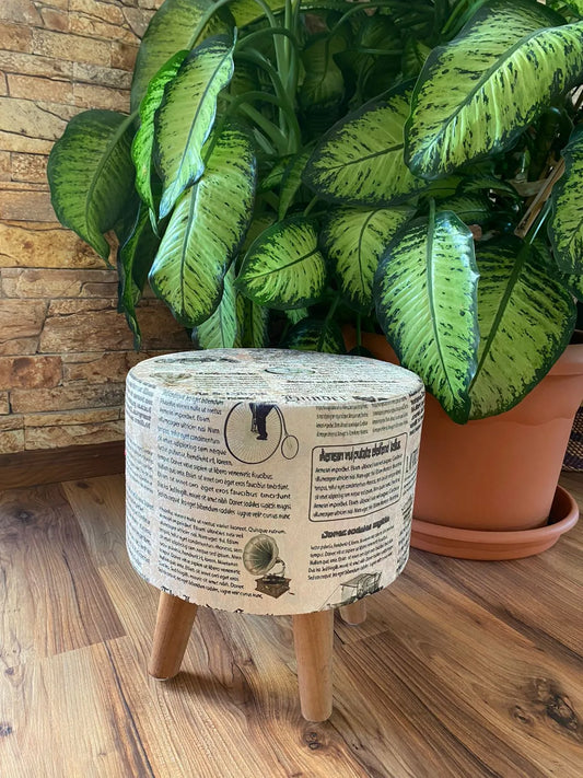 Avioni Home Premium Collection – Luxury Padded Stool / Ottoman (4 Legs With Natural Finish) – Newsprint Design