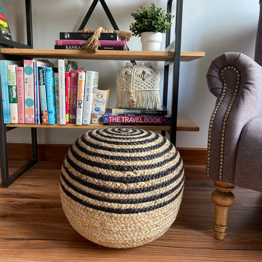 Avioni Home Boho Collection – Braided Natural Jute and Black Pouf / Ottoman
