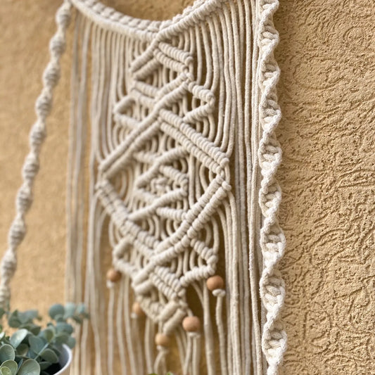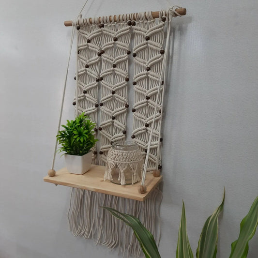 Avioni Home Boho Collection – Hand Knotted Macramé Hanging With Pine Wood Shelf