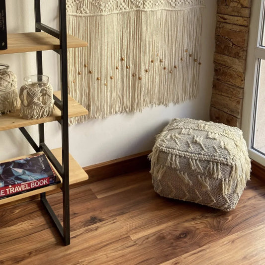 Avioni Home Boho Collection – Boho Cube Pouf With Tassels – Off-white With Black Stitching – 35cm x 50cm x 50cm