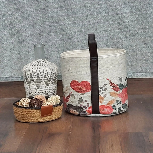 Avioni Home Hand Braided White Jute Basket | Designer Leatherette Handles | Canvas Inner for Extra Strength | Size: 28 x30 cms (~11×12 inch)