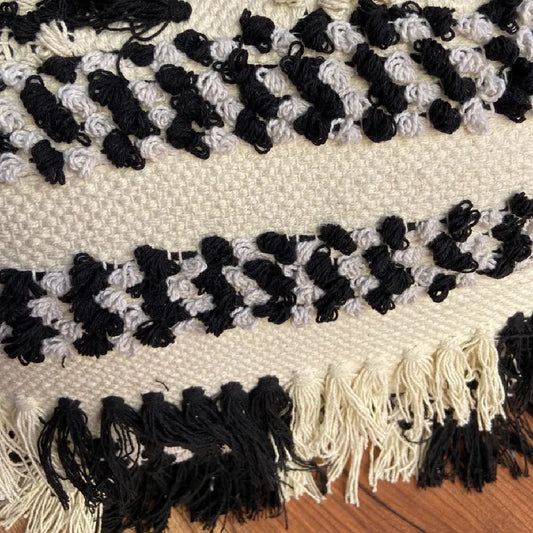 Avioni Home Boho Collection – Boho Pouf in Black and White with Braids and Tassels – 35cm x 50cm x 50cm
