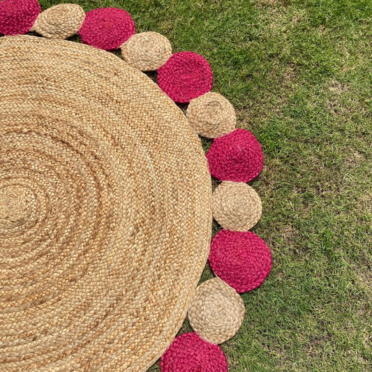 Avioni Home Eco Collection – Handwoven Braided Jute Round Carpet with Pink Circle Borders