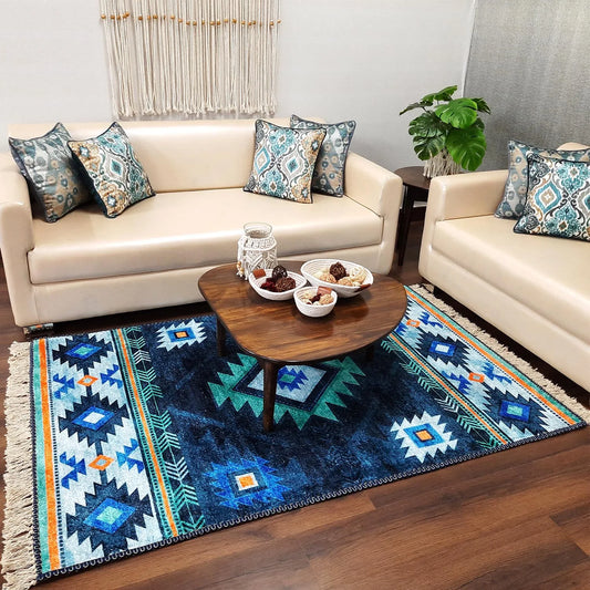 Avioni Home Faux Silk Carpet For Living Room – Ethnic Tribal Design Premium Rug Blue